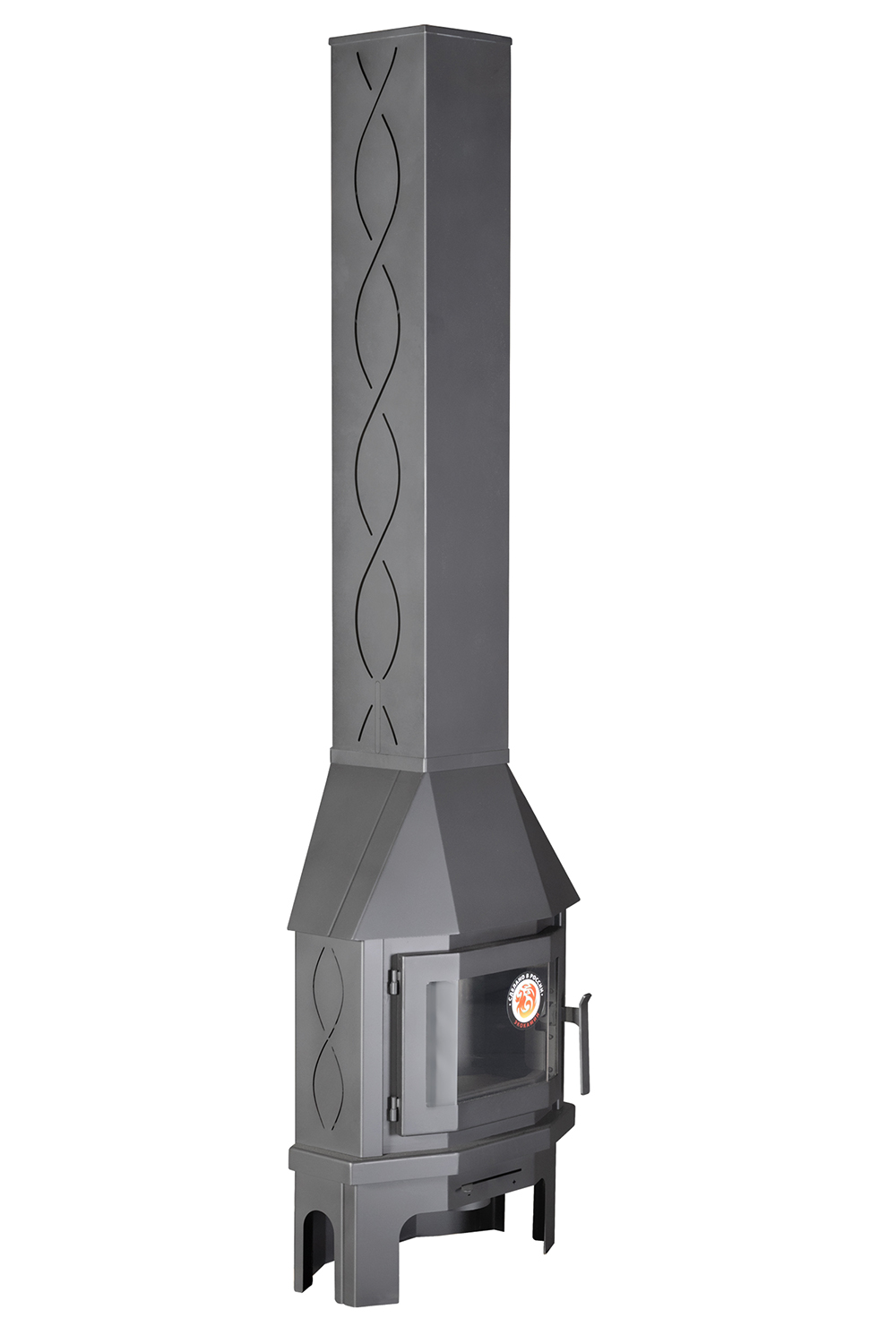 Система подключения дымохода сверху обеспечивает эффективное удаление дымовых газов, а конструкция камеры двойного сгорания обеспечивает высокий КПД в 80%. Габариты камина (ВхШхГ) составляют 2147х600х334 мм, а вес - 64 кг.
